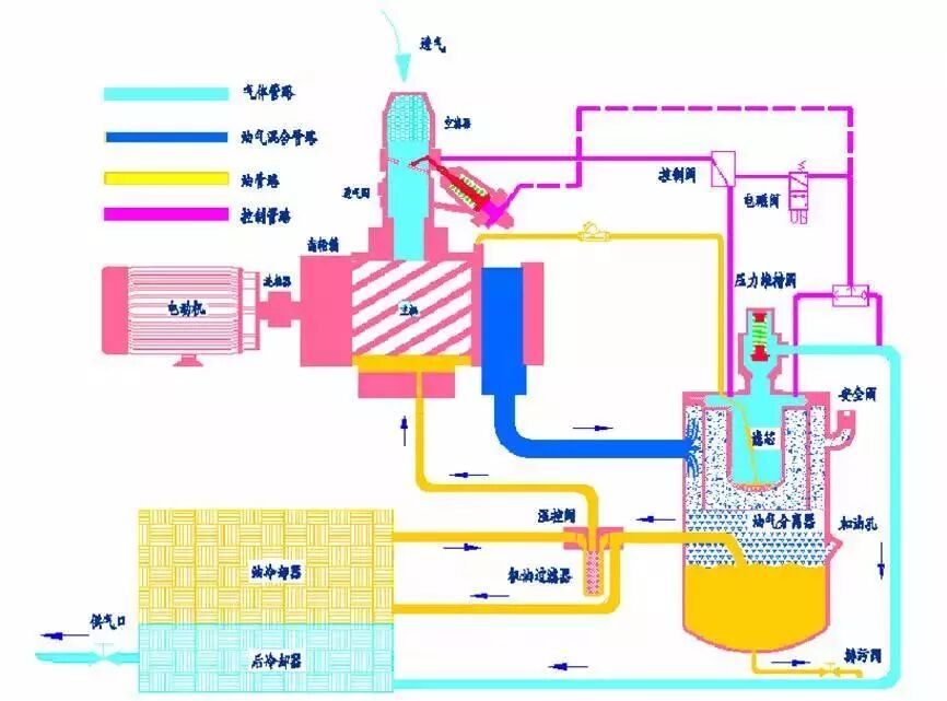 二、螺杆空压机常见安装示意图 三、螺杆空压机运行示意图 四、螺杆机与活塞机的特点 五、螺杆空压机维护 六、螺杆空压机开关机操作规范 开机前注意事项 1、 检查三相电源,确认正常。 2、打开机器门锁,观察空压机油位,此时油位不能低于低位,否则需要补充冷却液到正常位置。 3、打开控制器电源,观察液晶显示屏上有无异常显示。显示“设备已停机”,表示正常。 4、打开空压机出口阀门。 5、以上检查无误后,可按下空压机启动按键,即(ON)按键,空压机即可正常工作。 运转注意事项 1、开机后,要观察空压机运转3~5分钟。观察有无异常响声及振动、有无泄漏油、气等,否则应立即停机检查。 2、动转中的管路及容器内均有压力,严禁松开管路或栓塞,以及打开不必要之阀门。 3、运转中应注意观察油位。机器运转时油位比停机后有所下降,属正常现象。看不到油位,且排气温度高达100度时,应立即停机。停机10秒后观察油位,若不足则待系统内无压力时补充润滑油; 4、气体被冷却器冷却后,会产生一定的凝结水,应定时排放,否则水分会被气体带到后系统内;根据天气原因、排放水时间可灵活调节,一般夏季比较频繁。 5、运转过程中,至少每天应记录电压、电流、出口气体压力、出口排气温度、油位等参数,供日后检修作参考之用。 停机注意事项 1、首先按下OFF键,10~15秒钟后智能控制器按预编程序停车。电动机才会停止。避免空压机重负荷下直接停机; 2、必要时,按下急停开关(红色按键),切断主控器和接触器电源。 3、空压机停机后,不能马上启动,需等1~2分钟左右,等系统将内部压力自动排空,以防重负荷启动损坏电机。 4、空压机在调试后,根据实际情况将压力和其它参数调好,设为全自动控制模式。一般情况下,用户不必自行调整。 七、螺杆空压机润滑油 作用 润滑、防锈防腐、密封、冷却、清洁。 分类 一般由基础油和添加剂两部分组成,常分为矿物油、合成油,轻、中、重负荷三个级别。 选用 L-DAG,粘度15#、22#、32#、46#、69#、100# L-DAH,粘度32#、46#、32A#、46A#。 注意事项 禁止不同品牌、型号混合使用,禁新旧混用,必须及时更换。 八、螺杆空压机常见故障 高温或高温故障停机 劣质油或油品不良,缺油;油过滤器堵塞或油路不畅;风扇电机故障(接触器故障);空滤堵塞;温度传感器失灵;冷却器散热不良或散热片堵塞;温控阀故障;主机损坏。 相关链接:轻松应对空压机高温 整机耗油油量大 非排气含油量高:润滑管道泄漏或密封件失效 含油量高:回油管是否畅通; 油面太高;长期低压运行;油分失效;油品乳化或变质;精密过滤器失效;加卸载过于频繁。 相关链接:几分钟让你解决空压机跑油问题 电器故障 电器部分动作是否正常(电压偏高、偏低、接触器不良);电机故障;电源开关接触不良。 不加载产气 进气阀故障;电磁阀故障; 其他故障:控制气管漏气/堵塞、控制接线松动、控制器按键失灵。 非正常停机 非过载停机:高温停机、电源故障、接线松动、回路继电器或保险故障; 过载停机:排气压力过高、热继电器故障、润滑油黏度变大、主电机故障、电机或接触器接线松动、主机故障、设定值偏小。 维修保养时务必请关闭电源、完全卸压。